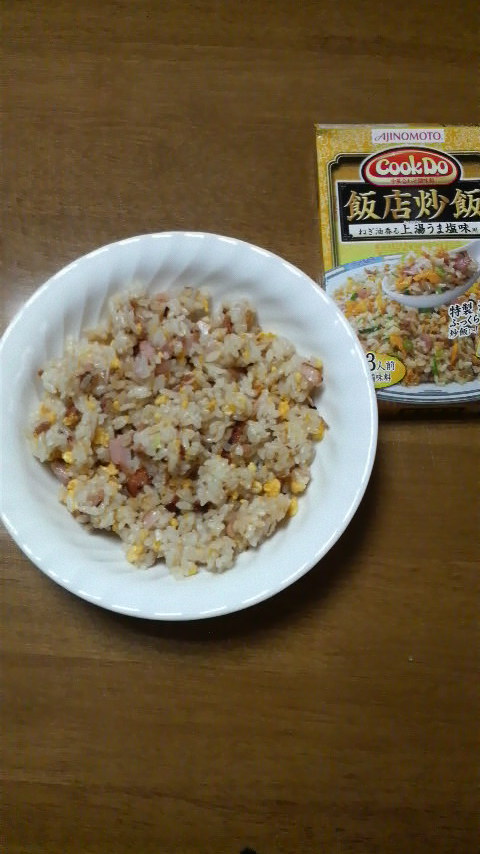 味の素の『飯店炒飯』、これはお手軽で実に美味しい。拙者の推奨は黄色い箱の上海うま塩味。これを用いて、あとは軽く塩コショウにしょうゆをひとかけ、これでもう玄人はだしの味でござる。