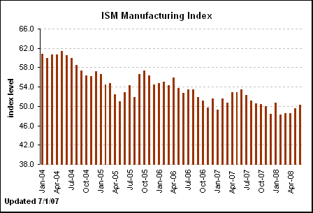 米サプライマネジメント協会(ISM)が1日発表した6月の製造業景況感指数は50.2と前月より0.6ポイント改善し、好不況の分かれ目である50を5カ月ぶりに上回った。前月を割り込むとの見方が多かった事前予測を上回ったが、インフレ懸念を示す指標は一段と上昇している。