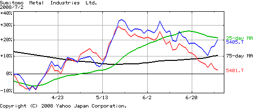 そうそう、最近気になっているのが住金の動きです。大手高炉メーカーは大体似たような動きをする事が多いんですけど、ここ数日住金だけ目立って強いんです。僕はペアトレードってのが結構好きなので、住金売りの新日鉄買いでもやろうかと思ったんですけど、住金のシームレスパイプはバカに出来ないので(原油高も追い風になりそうだし)このまま二極化する可能性もあるなと思って止めて置きました。自動車売れないと鉄も売れないので、その辺の動きには注意して置きたいですね~。