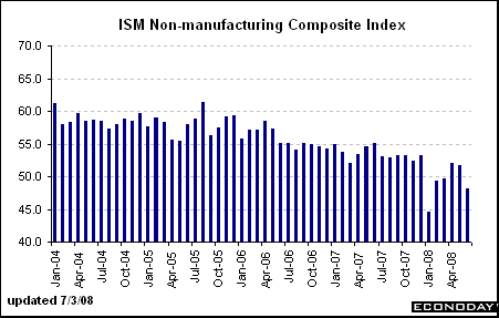 米サプライマネジメント協会(ISM)が3日発表した6月の非製造業景況感指数は、総合指数が前月比3.5ポイント低下し、48.2となった。好不況の分かれ目である50を割り込むとともに、市場予想も下回った。項目別では「価格」指数が84.5と同7.5ポイント急上昇し、エネルギーや原材料高でコスト増に悩む企業が多いことを示した。