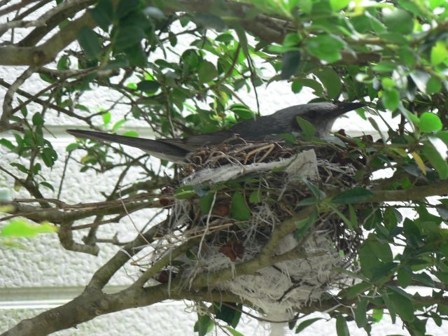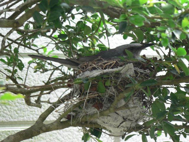 裏庭のツゲの木に鳥の巣発見、窓からパチリ・・・何の鳥だろう。