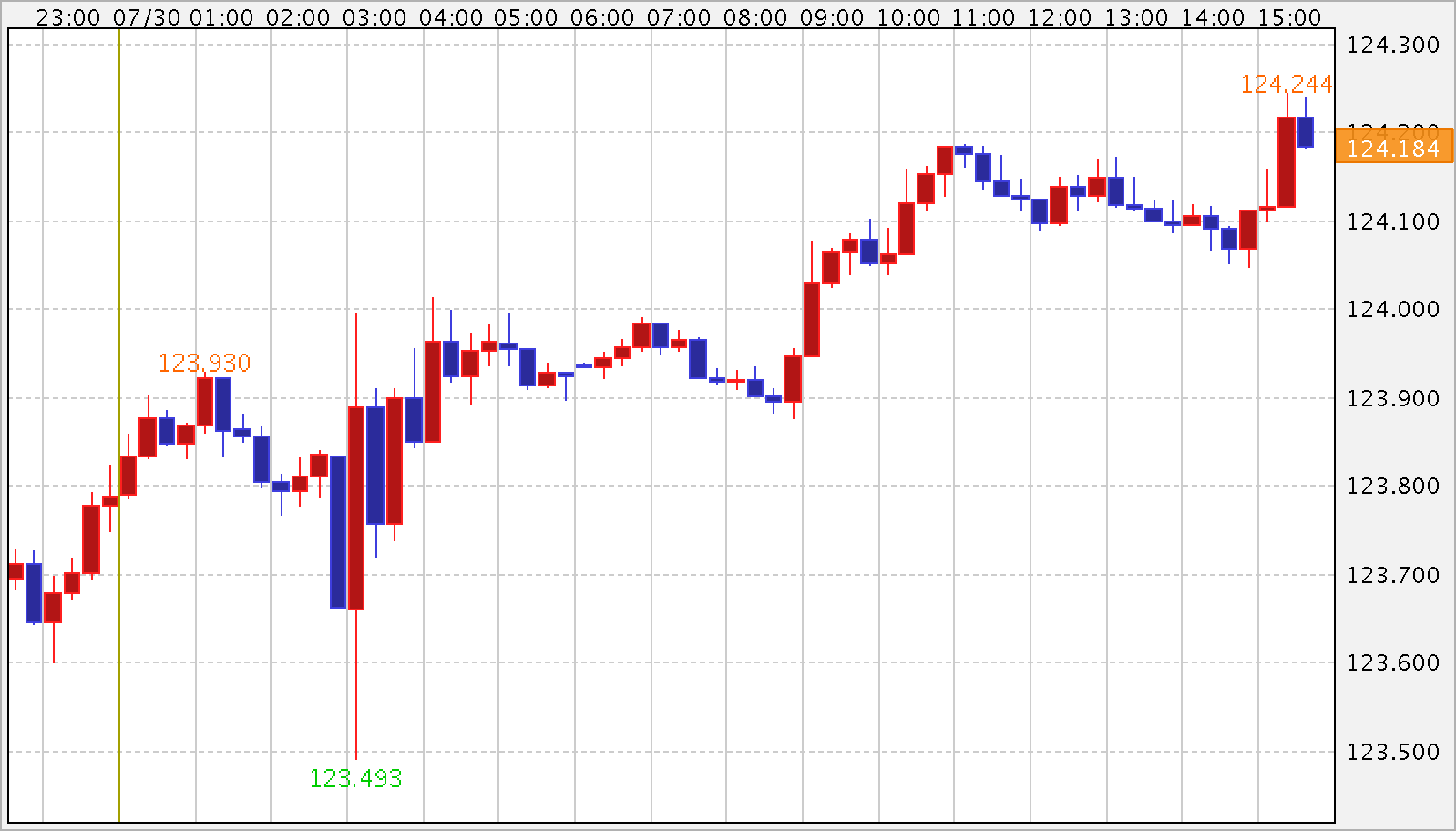 海外市場では、1ドル=123.50〜124.00円台と久々に124円台を回復しました。欧州市場では、FOMCを前に様子見ムードが続き、安値近辺で細かな値幅が続きました。
