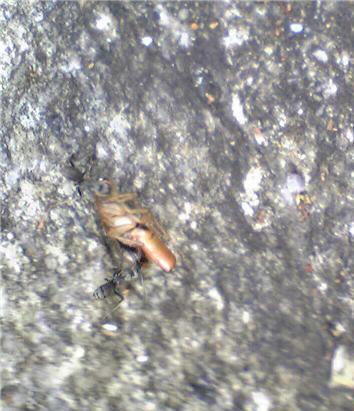 ありが共同作業です。最初頭を持っているアリが1匹で運んでいましたが、丁度2匹になったとこです。自分の体重20倍も有ろうかという虫を運んでいます。人間と違ってすごいです。