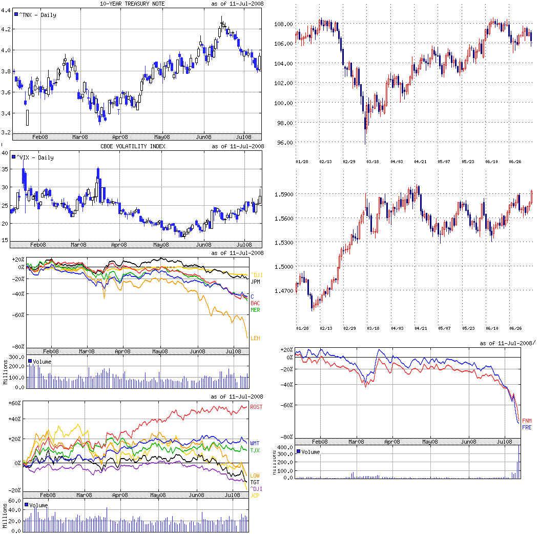 ファニーメイとフレディマックへの当面の処置としては、Fedがディスカウントウィンドウを使って貸し出す(Fedが金融機関に公定歩合で直接貸し出す)案が浮上しているようですね。でもこの制度って、資金繰りが困っている時に有効なものであり、現在必要とされているのは毀損した資本に対しての穴埋めでしょうから、効果の程はどうなんだろうって思います。もしかしたら、ろくでもないものを担保にFedが長期間資金を貸し出すってことかもしれません(なし崩し的な公的資金の注入?)。この辺がはっきりしない限りは、ぐずぐずした相場が続きそうです。