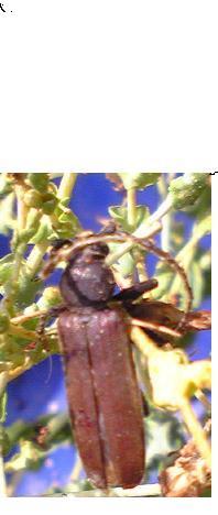花の上にカメムシがいてそれらに混ざってカミキリムシがいます。この辺のものは図鑑を見てもわからないです。