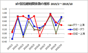 次に、日経平均とNYダウの月ごとの相関係数の推移をグラフにしてみました。相関係数は日足の終値で月末にその月の分を計算しています。市場によって祝日が異なるので、祝日はその前日の終値を採用。10月は半月分のデータしかありません。