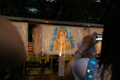 で、地下鉄に乗って九段下に行ったのは良いんですけど、なんかめちゃくちゃ混んでるしピーヒャラピーヒャラ聞こえるし何かと思ったらみたままつりってお祭りをやってました。そう言う訳でビアガーデンは却下されてしまい(バニーちゃん…)お祭りへ行ったのですが、なかなか大きなお祭りで楽しかったです!提灯がきれいでした。ブラブラしていたら小林よしのりさんの書いたぼんぼり?(三枚目の画像です)とかあって靖国神社のうんぬんかんぬんのお祭りなんだな~と実感。