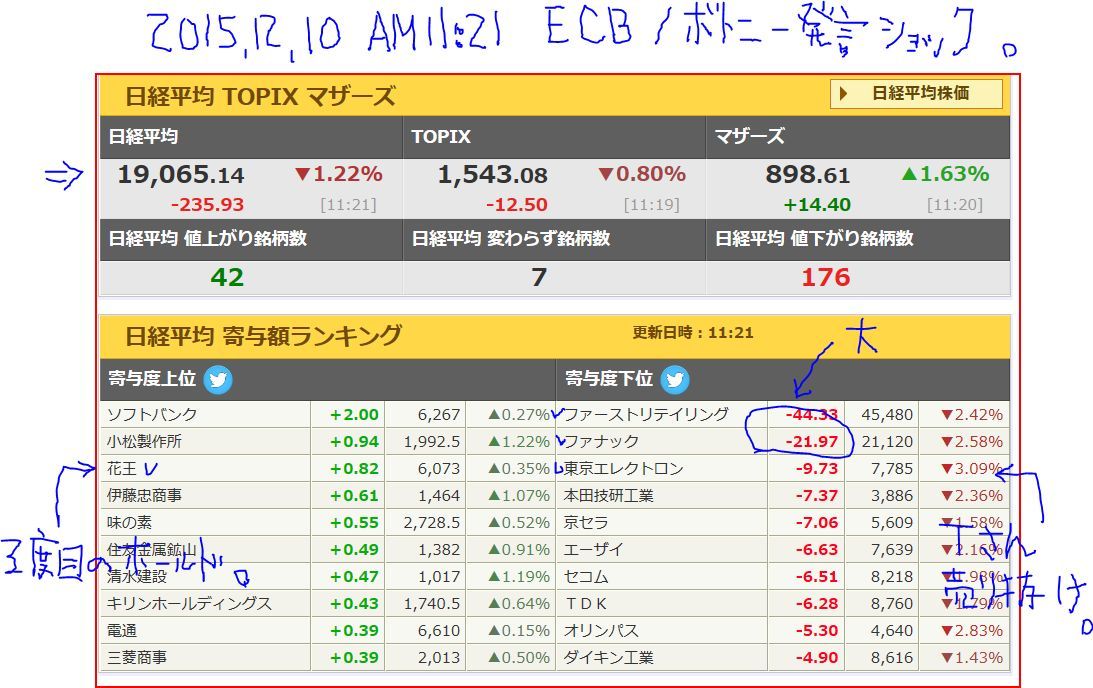 19,049.66 ▼1.30% -251.41・・・AM11:20頃の日経寄与度 添付。![]()