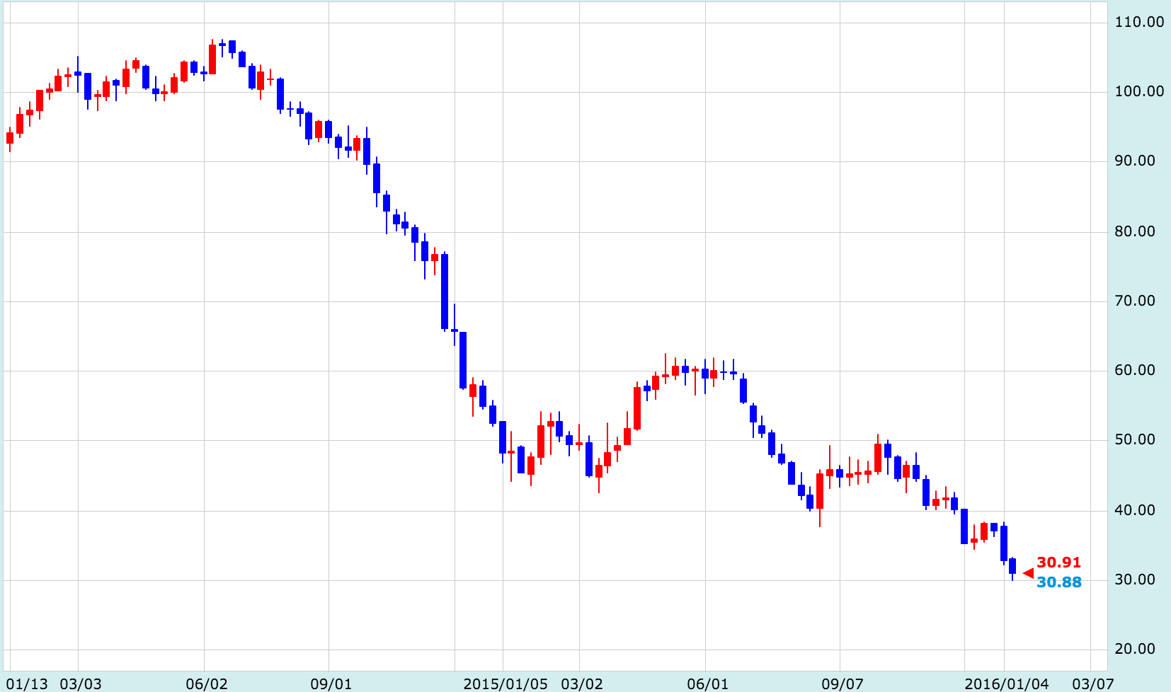 ここでちょっとした原油ネタ。速報メールがありましたので多くの方がご存知かと思いますが、昨夜のNY原油市場で先物価格が1バレル=30ドルの大台を割り込んで、12年ぶりに20ドル台に差し込みました。