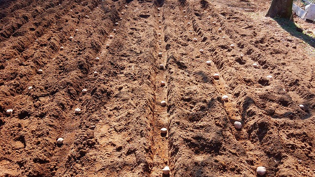 じゃが芋とじゃがいもの間に肥料を置いて砂で覆います