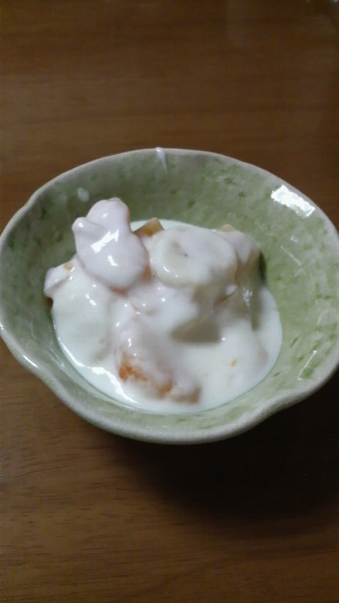 ご指摘の通り、フルーツのヨーグルト和えでござる。缶みかん、フルーツ缶、バナナ、ナタデココ、マンゴー缶、あと季節によってはイチゴなどを入れ、砂糖、ハチミツ、レモン汁で味を整えまする。