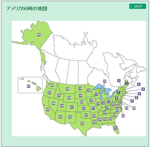 39.モンタナ 40.ワイオミング 41.コロラド 42.ニューメキシコ 43.アイダホ 44.ユタ 45.アリゾナ 46.ワシントン 47.オレゴン 48.ネバダ 49.カリフォルニア 50.アラスカ