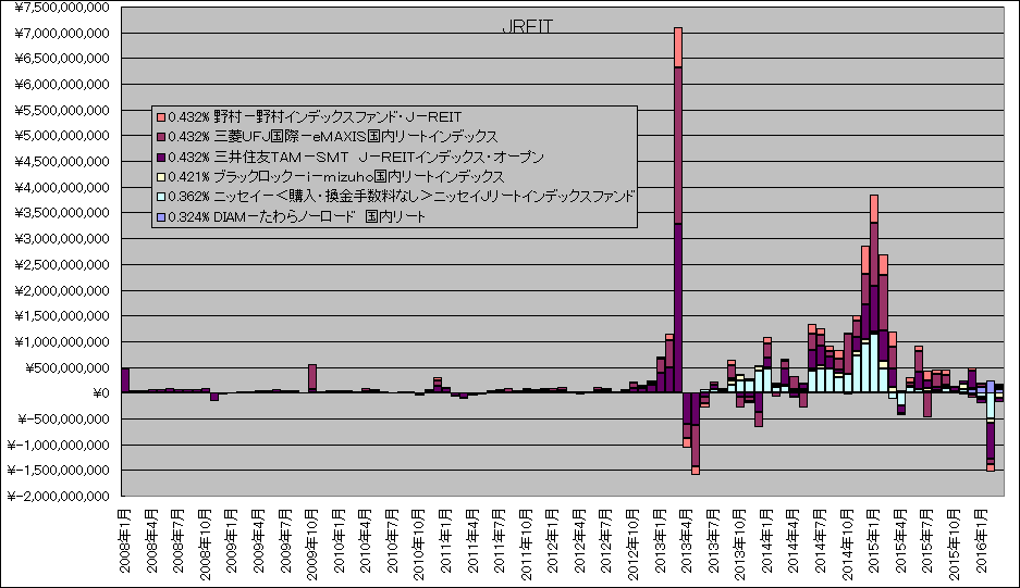 インデックスファンドの月毎の資金流出入額を、まとめました。