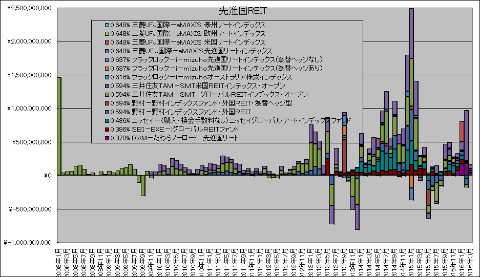 インデックスファンドの月毎の資金流出入額を、まとめました。