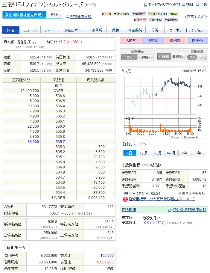 現在、三菱UFJは優待用の1000株のみ確保しています。