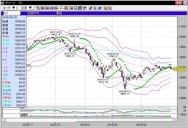 日経平均のパラボリックは別添えの画像の通り転換を示唆しており、下落基調となる可能性が高まっていることに注意が必要。