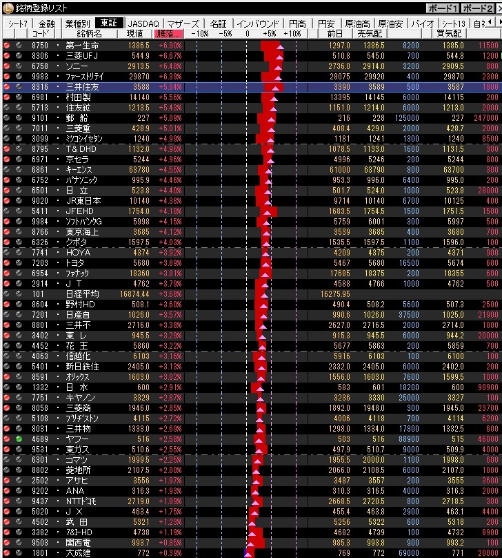 別添えの画像の通り、主要銘柄では昨日下げた銀行、保険、ソニーが上昇。