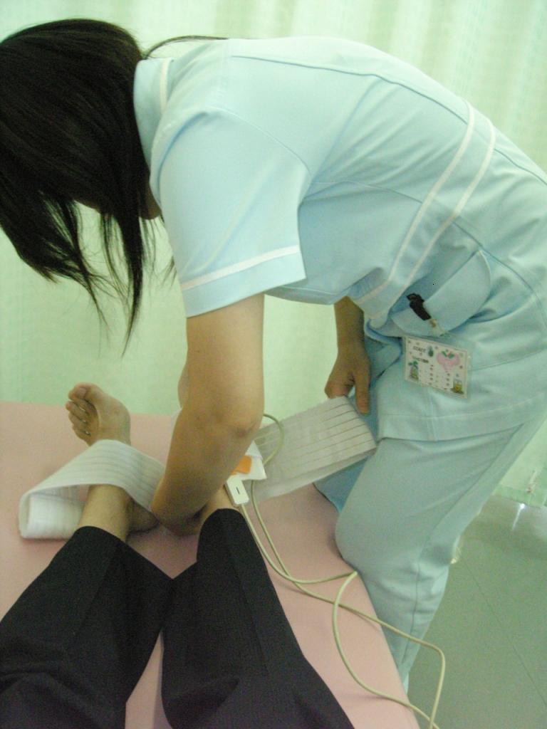 足首の筋肉に電撃を強制的に流して伸縮させ、衰えた筋肉に従来の働きをさせるのが狙いでつ♪ハイ