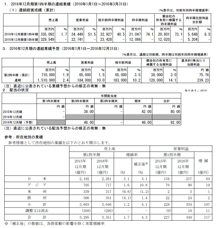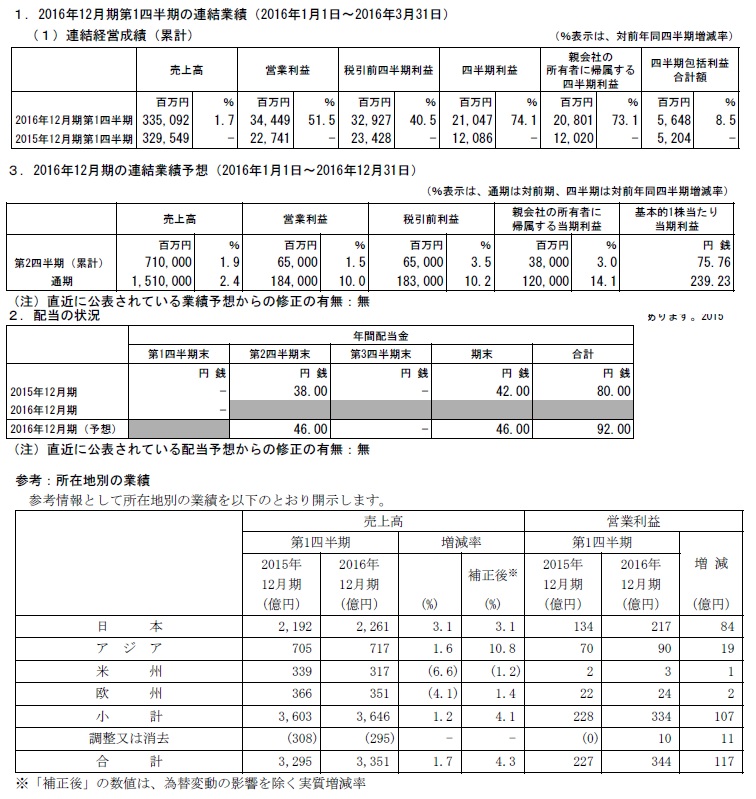 円高は海外事業の減収要因(円建てベース)となるためネガティブだが、石化原料価格低下が利益増加に寄与。(地域別業績については別添画像参照)
