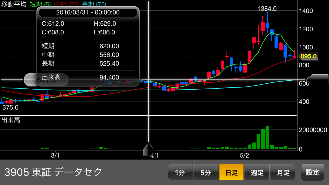 1,200円前後を下限目安に2,000円方向。2,000円大台乗ると上場来高値3,075円まで上値スカスカ。