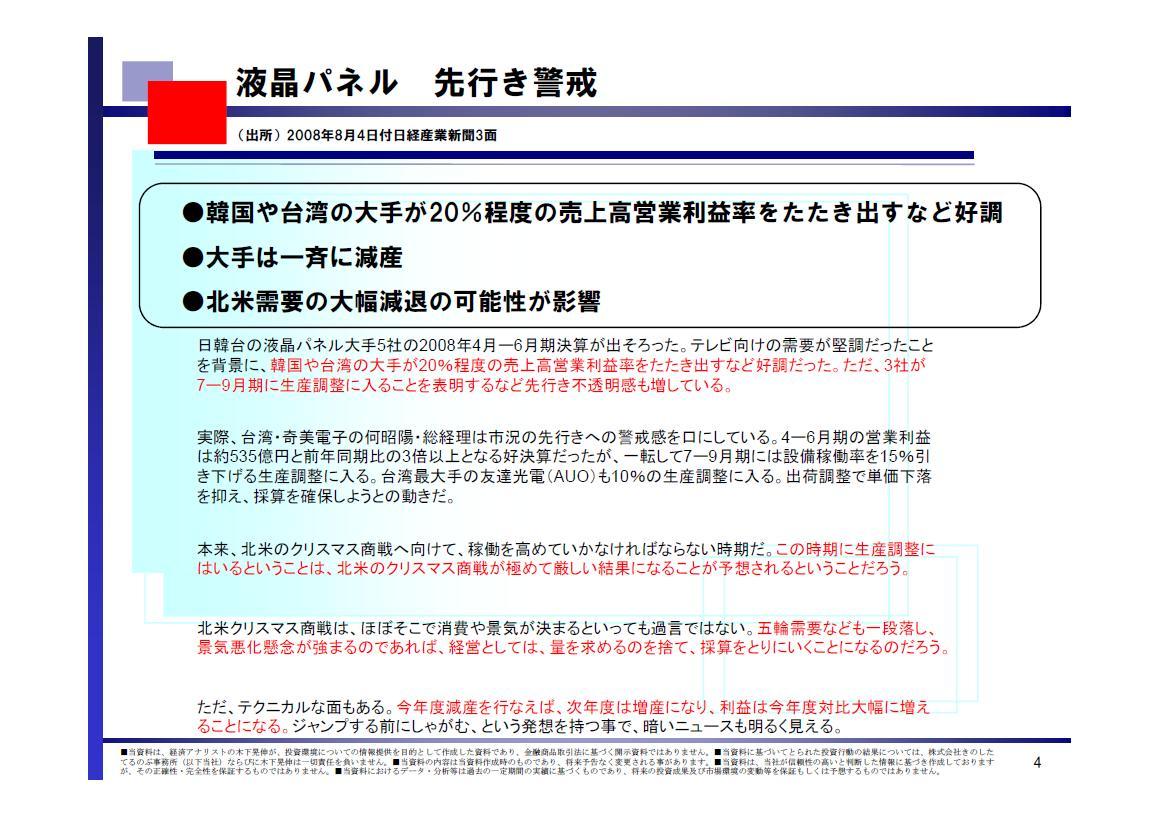 日韓台の液晶パネル大手5社の2008年4月ー6月期決算が出そろった。