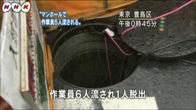 5日午後0時15分ごろ、東京・豊島区雑司が谷の下水道工事の現場から「マンホールの中で工事をしていた作業員が流された」という通報が東京消防庁にありました。警視庁によりますと、現場で作業をしていた6人が流され、このうち1人は自力で脱出しましたが、残りの5人の行方がわからなくなっているということです。現場は、地下鉄有楽町線の東池袋駅から南に500メートルほど離れた住宅街で、東京都によりますと老朽化した下水道管を補修する工事が行われていたということです。現在、東京消防庁や警視庁が5人の救助作業を進めています。東京都によりますと、この工事は都が発注する下水管の補修工事で、作業員は縦1メートル60センチ横2メートル10センチのコンクリート製の長方形の管の中で、内面にプラスチックの板をつける作業をしていたということです。
