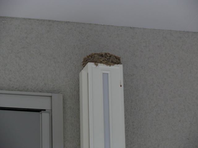燕が玄関の照明の上に巣を造ってくれて、出入りするたびに監視されているし