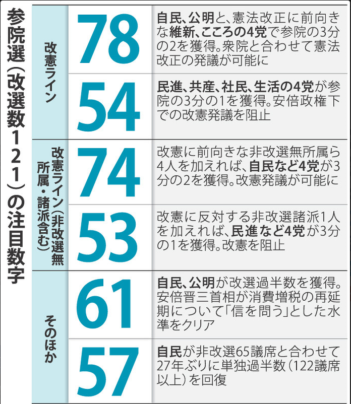 ■改憲発議には定数242の3分の2(162議席)が必要だ。