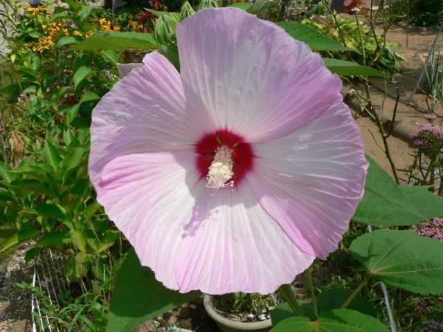 庭の大きい花『アメリカフヨウ』です。花の直径20cmあります、パーっと開いています。