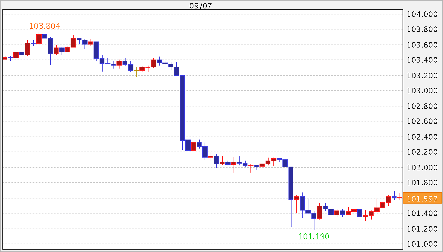 海外市場は、1ドル=101.90〜103.40円台で急落しました。欧州市場では、高値圏でモミ合いが継続。NY市場では、(米)8月ISM非製造業景況指数が予想を大きく下回ったことで、9月利上げはないとの見方が広がって大きく値を下げました。