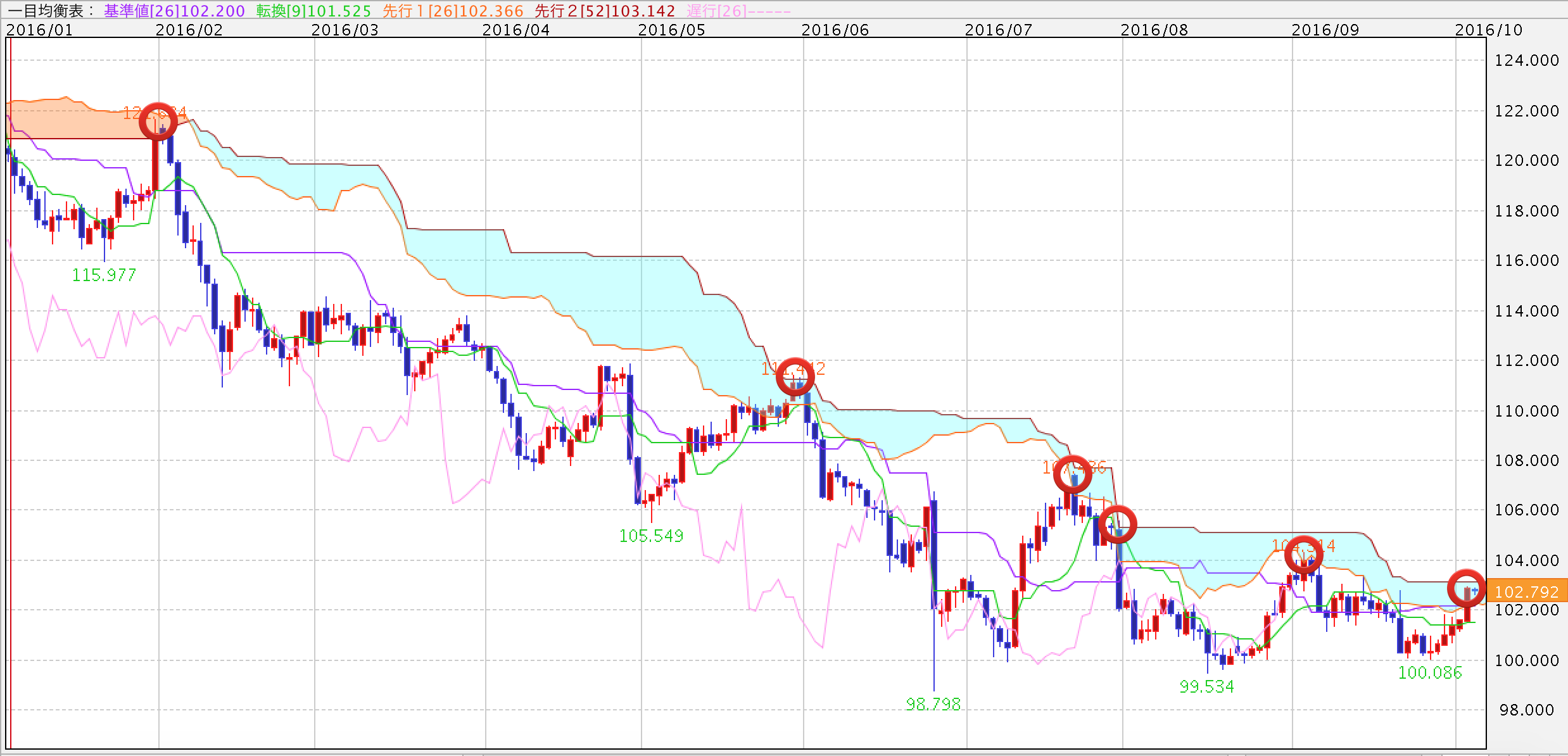 103.14円にある一目均衡表の雲の上限にジワジワと近づいています。以前から何度も書いているように、このレジスタンスに対しては、すでに今年5度失敗していますから、今回の6度目のトライで達成なるかどうかが注目されているんですね|ω'*)ジー