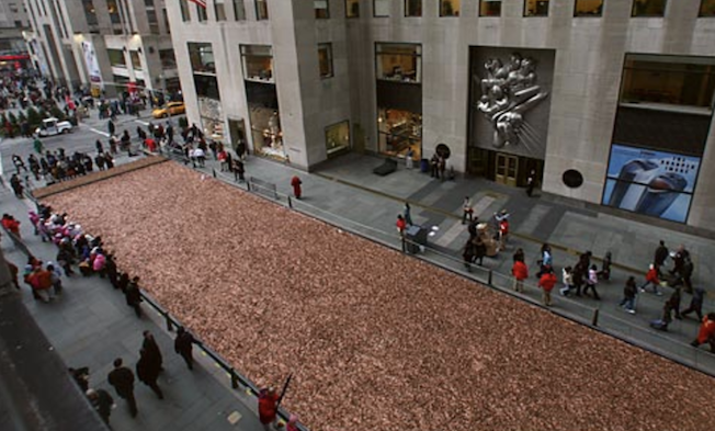 ↑実は全部お金!NYロックフェラーセンターで1ペニーを集めて1億円。