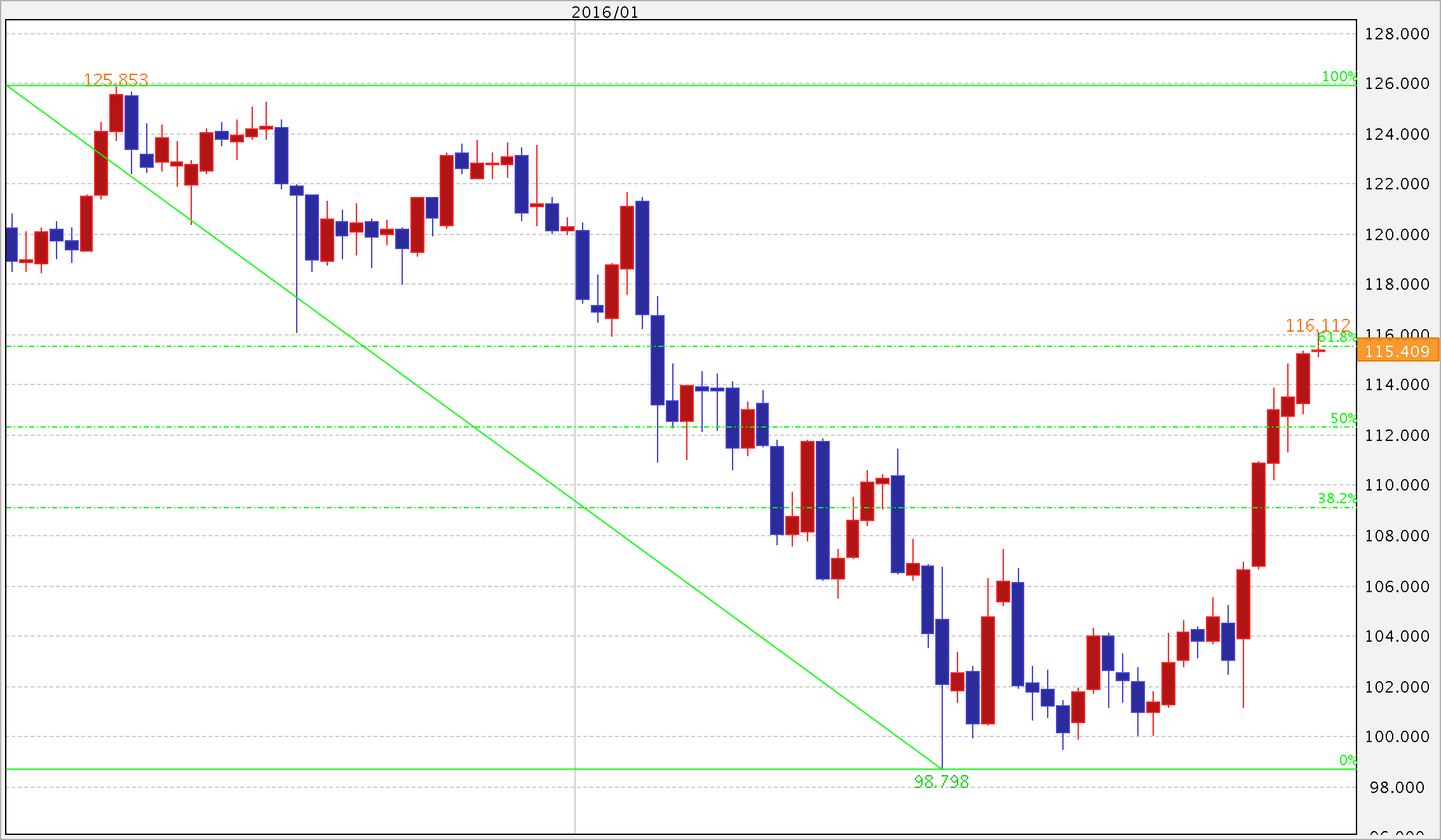 風邪で寝込んでる間に1ドル=116円達成とか・・・_(┐「﹃゚。)_ヒドイ… あっさり昨年の最高値である125.86円と今年の最安値となる98.79円の61.8%フィボナッチリトレースメントを達成です。