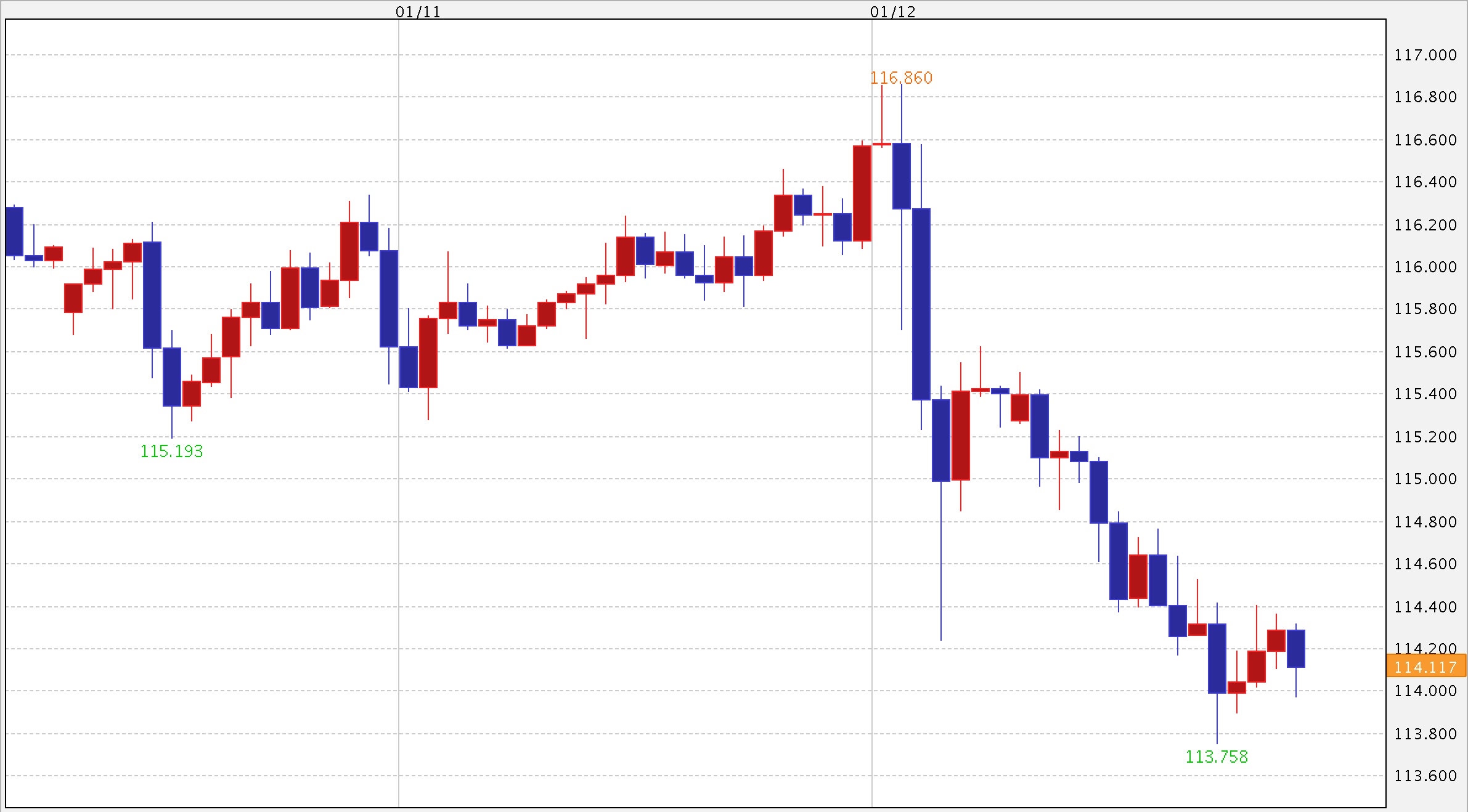 海外市場は、1ドル=114.20〜116.80円台で大きく値を下げています。欧州市場では、欧州株の堅調な推移やトランプへの記者会見に対する期待感もあったのか、徐々に上値を伸ばしました。