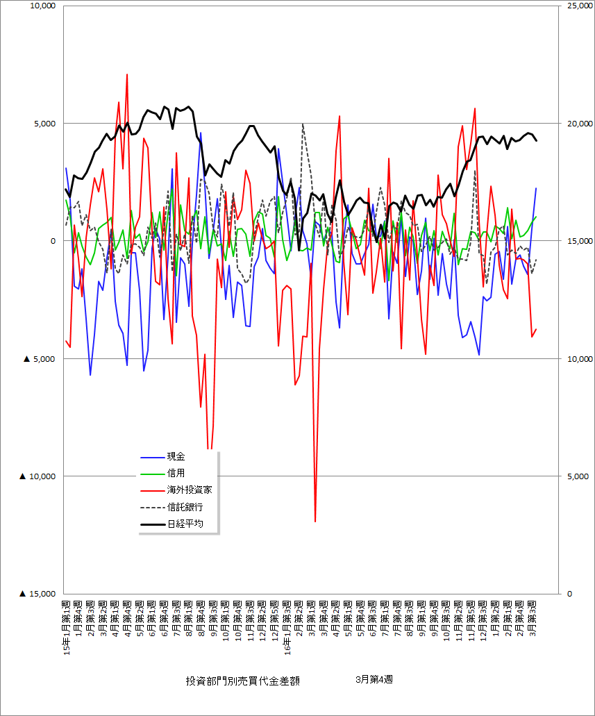 で、3月第4週の投資部門別売買代金差額のグラフです。海外勢はまたも大きく売り越し。