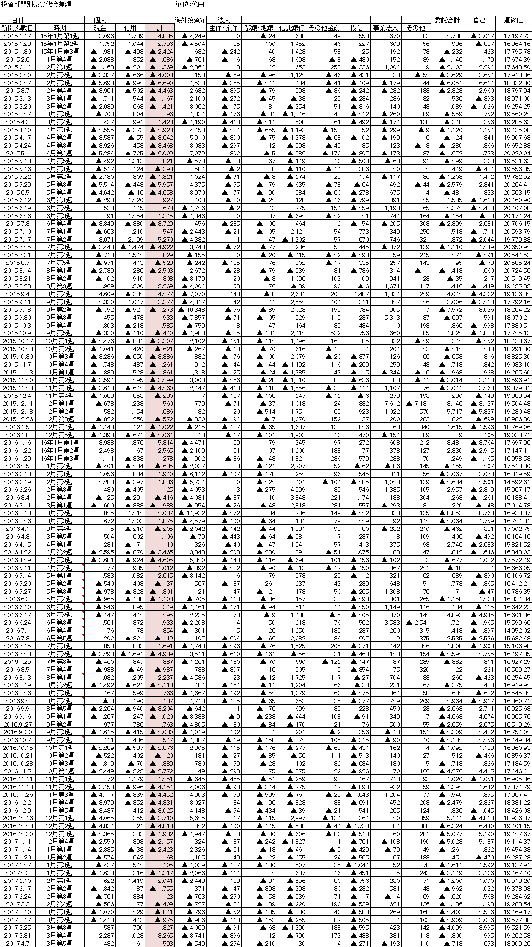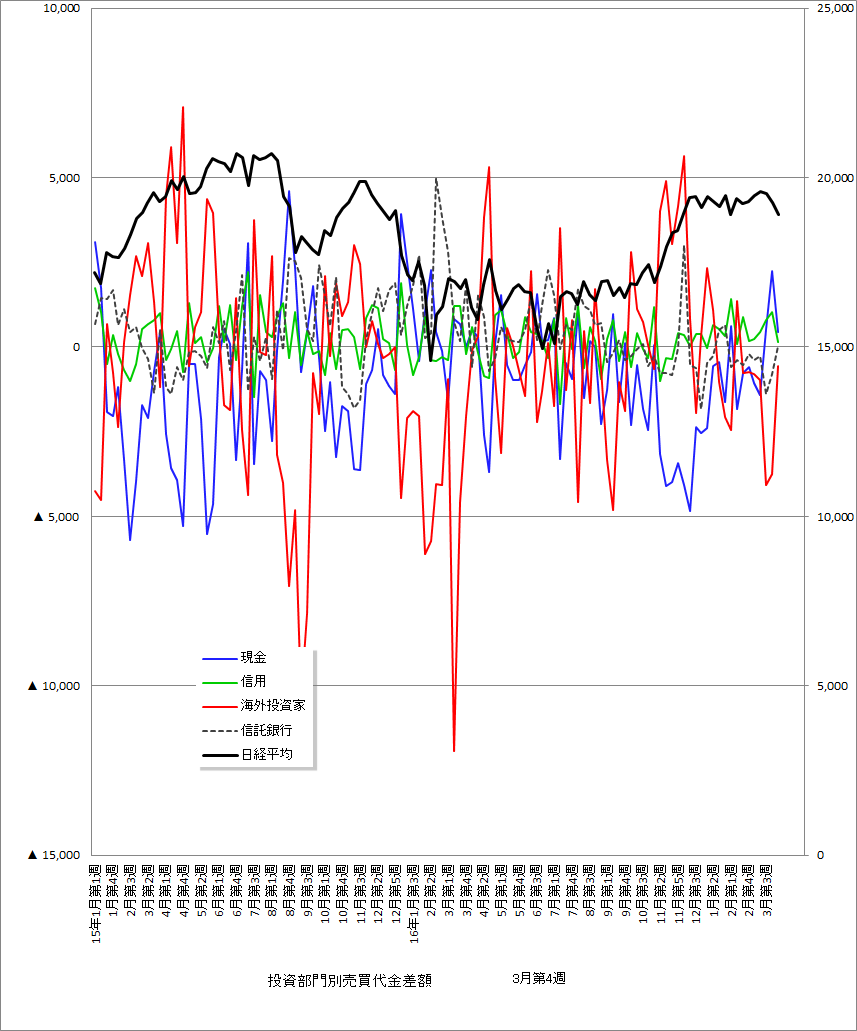 で、3月第5週の投資部門別売買代金差額のグラフです。さすがに海外勢の売り越しも細ってきたようです。