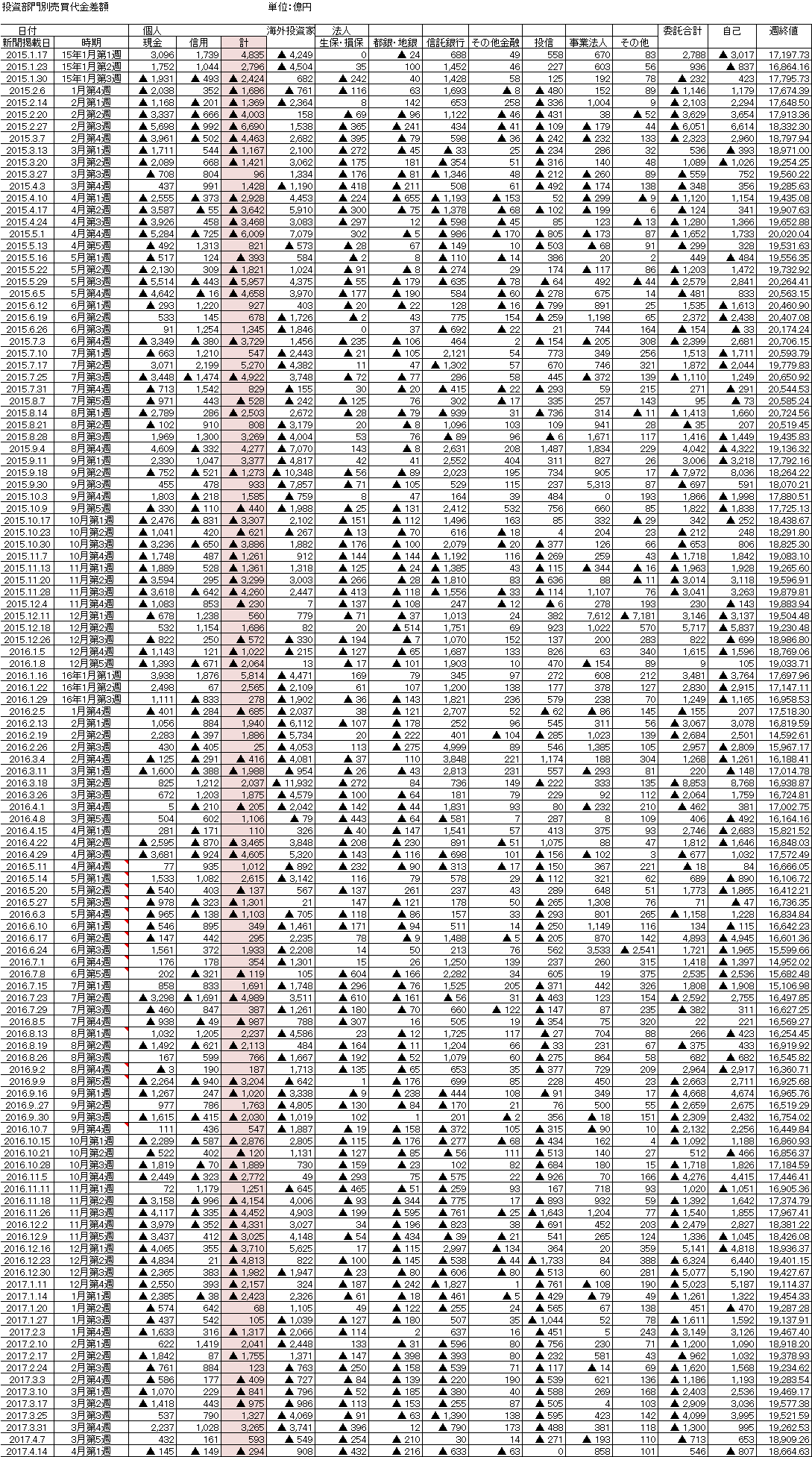 で、4月第1週の投資部門別売買代金差額のグラフです。海外勢は8週ぶりに買い越しですが、額はショボいですね。