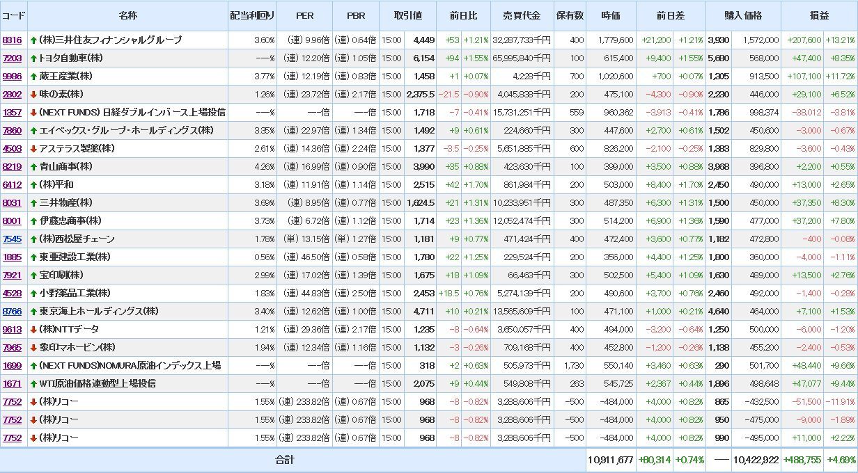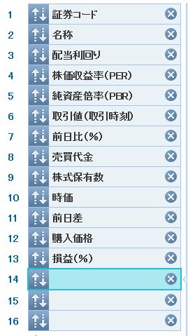 「株式保有数」「時価」「前日差」「購入価格」「損益(%)」