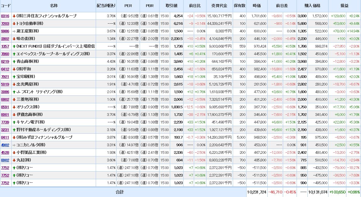 今週 :201,268→100,650 △100,618(実現益+ 91,270)☓