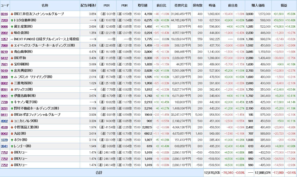 週末に、ついに含み損に。含み益銘柄を処分し続けたので、