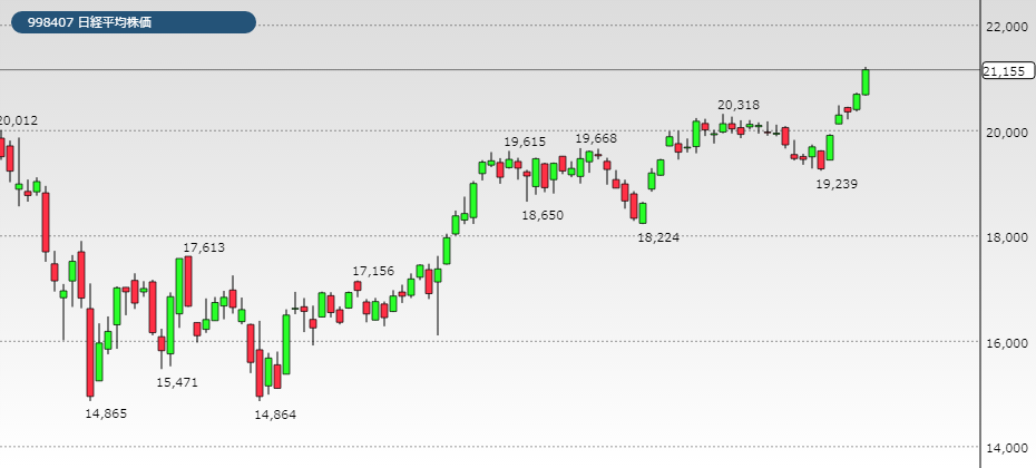 ヤフーの日経平均の週間足でーー