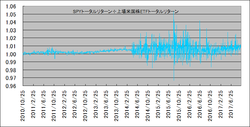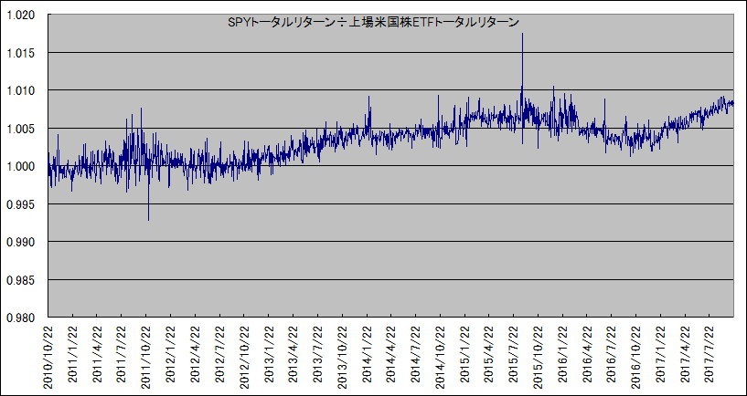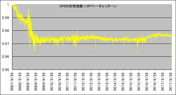 先物運用の理論的なパフォーマンスを表すS&P500先物指数と、現物運用の一例としてSPYのトータルリターンを比較すると