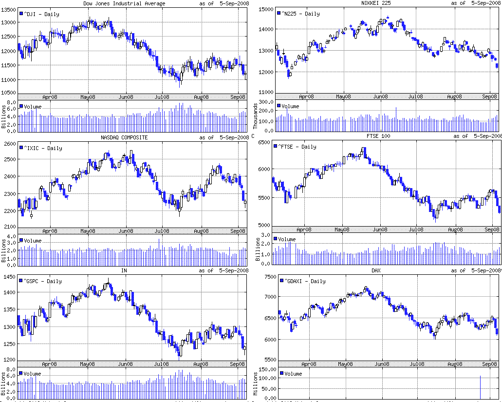 金曜日の米株式市場の引け後に、フレディマックとファニーメイへの政府支援が早ければ今週末にも発表されるのではないかというニュースが流れました。内容についてははっきりしていないのですが、今のところ出ている情報では、両社を政府管理下へ置く、経営陣を入れ替える、公的資金を段階的に入れていく、といった方策になるようです。このニュースを受けて、フレディマック、ファニーメイの株価は時間外取引で20%くらい下落しました。政府の救済により既存の普通株は大幅な希薄化により価値がほとんどなくなるか、もしくは無価値になる可能性があるからです。政府としては世論を考えれば、両社は暗黙の政府保証をバックにして利益を上げてきたのだから、最もその恩恵にあずかった経営陣と株主は救ってはダメということなのでしょう。だって血税を投入するのですから。しかし、何でこのタイミングに動きだすのだろうと思います。WSJには、党大会の終了に合わせてと書いてありますが、水面下で何かまずいことがあったのか?と勘ぐってしまいますね。