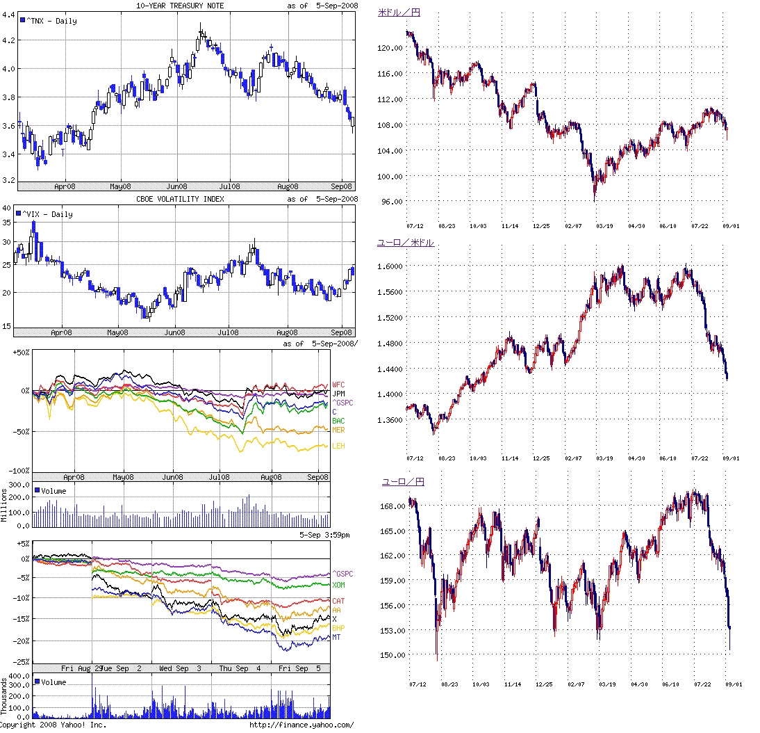 今週は、資源関連、新興国関連の銘柄が世界的に大きく売られました。画像2左下のチャートは、XOM(エクソンモービル)、CAT(キャタピラー)、AA(アルコア)、X(USスチール)、BHP(BHPビリトン)、MT(アルセロール・ミッタル)、^GSPC(S&P500)、の5daysチャートです。アルセロールミッタルなんて20%近く下がってますね。