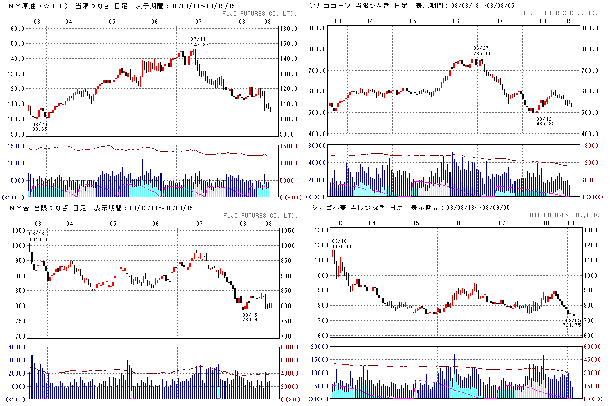世界的な景気減速懸念やヘッジファンドの破綻の噂により原油価格は下落しました。ほとんどリバウンドせず、あっさりと110ドルを割りました。次は100ドルを割るかどうかですね。ここのサポートラインは強そうです。