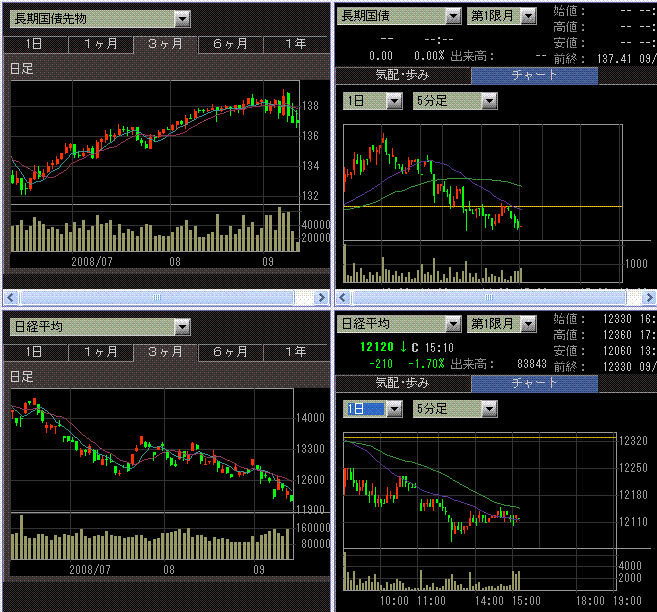 リーマンの経営再建策が期待外れに終わったことから、日経平均は続落して始まり、アジア株が安かったことから後場に一段安となりました。東証一部出来高は19.5億株、売買代金は2.07兆円と昨日に比べ減少しました。先物への売り圧力が強かったですが、オプションのP120売りに対する先物ヘッジ売りが出てたのも一因だと思います。9月限のP120の建て玉は4万枚くらいありましたから。