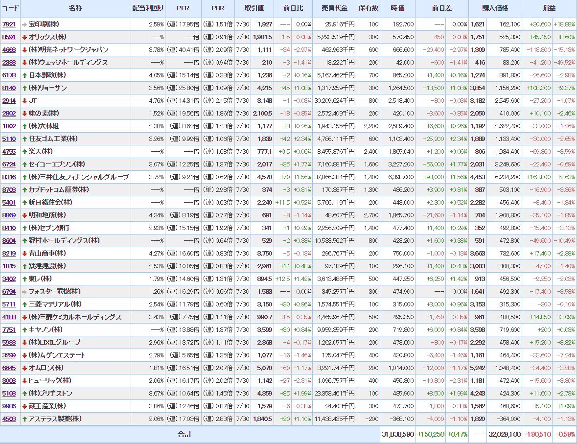 7/27:株投資原価:31,933,400、株投資時価:31,599,740、評価損:△333,660、キャッシュ:24,154,726