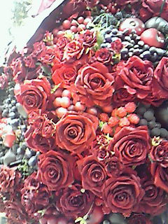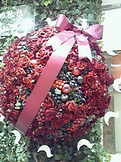 赤い造花と実の入っている飾りで、周囲に白い鳥の飾りがついています。
