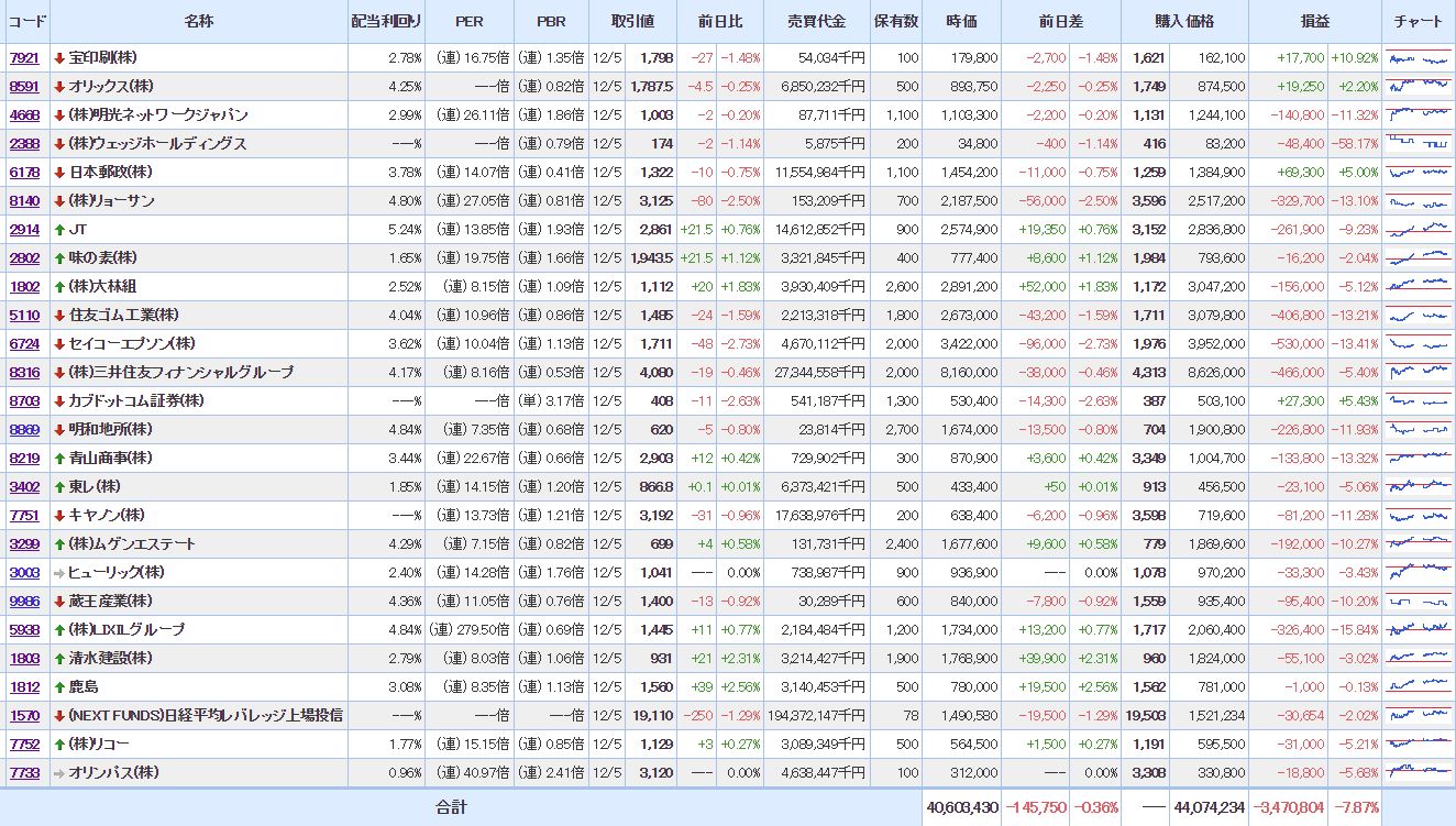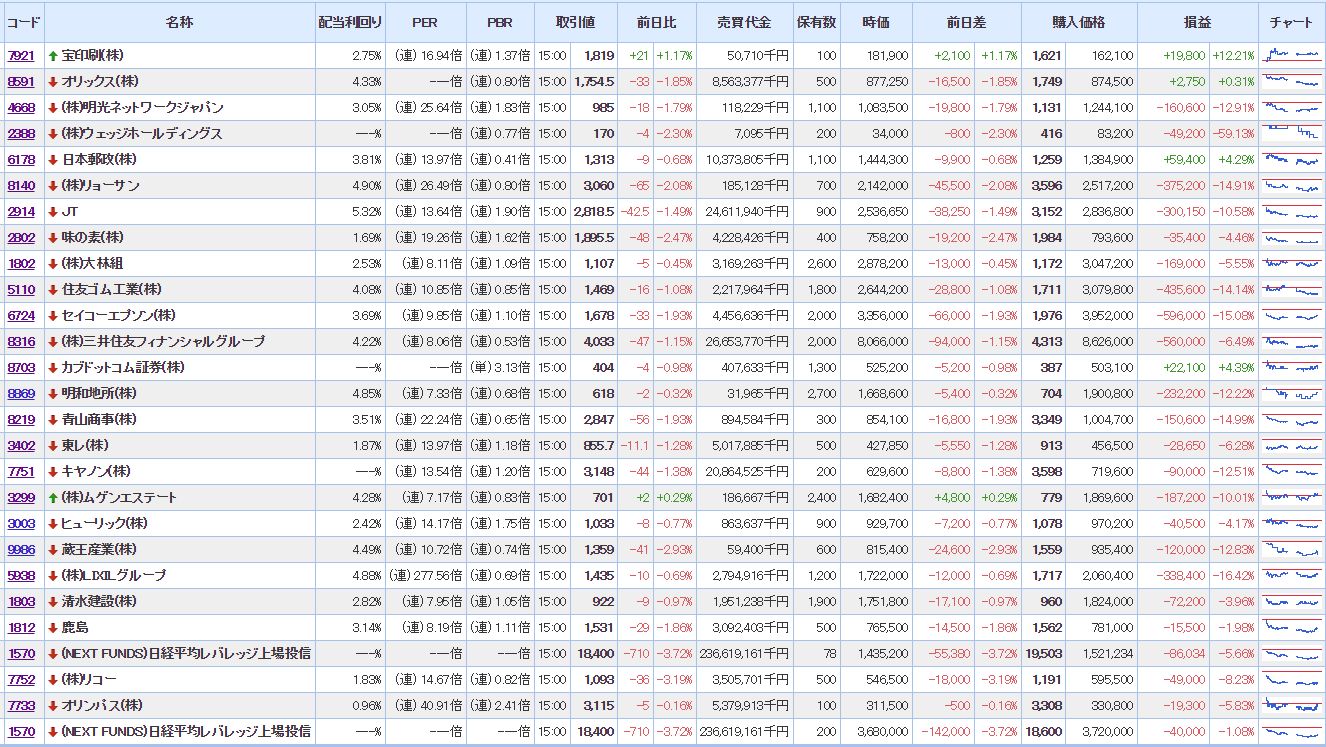 利益の出てる銘柄は利確しているので、含み損状態はしばらく続く。