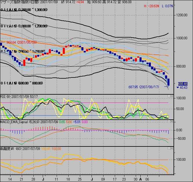 7月の書き込みから1ヶ月と10日経過。各移動平均線はきれいに下方へ拡散し、指数は底値領域に入ってきました。